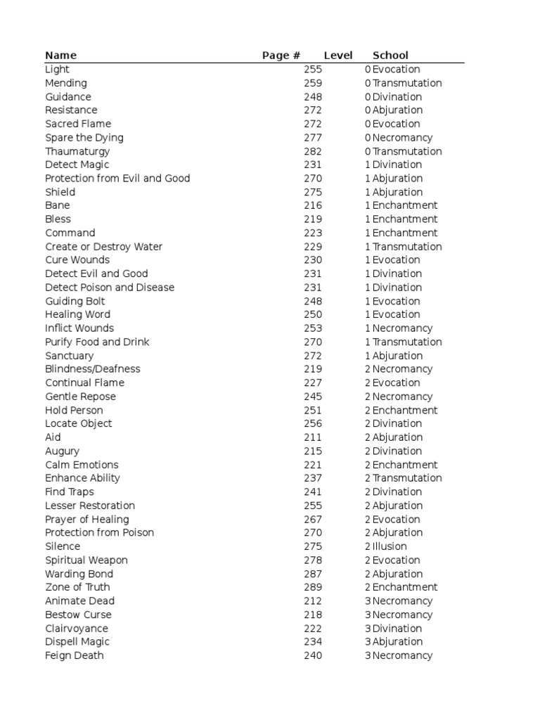 A comprehensive list of all official spells for fifth edition. Spell name school casting time range duration components; Cleric spells cantrips (0 level) guidance (divination) light (evocation) mending (transmutation) resistance (abjuration) sacred flame (evocation) spare the dying (necromancy) thaumaturgy.